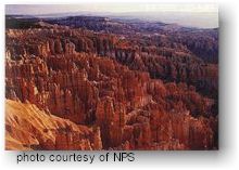 History Little is known of the native American inhabitants of the park area prior to Mormon pioneer settlement. Limited archeological studies indicate that this area was used primarily for hunting with most habitation in the river valleys below. Trips to the plateau were limited to harvesting its forest resources, including wild game. Later settlers continued this seasonal use. Bryce Canyon National Park is named for pioneer Ebenzener Bryce who came to the Paria Valley with his family in 1875. He was sent by the Church of Jesus Christ of Latter-Day Saints because his skill as a carpenter would be useful in settling this area. Bryce built a road to the plateau top to retrieve firewood and timber. He also built an irrigation canal to raise crops and animals. Local people called the canyon with the strange rock fomations near Ebenezer's home "Bryce's Canyon". The Bryces moved to Arizona in 1880, the name remained. As southern Utah developed, Reuben and Minnie Syrett--who homesteaded just outside the present park boundaries--brought their friends to see the intricately eroded stone formations. By popular demand, they developed sleeping and eating facilities on the canyon rim. They called their establishment, "Tourist's Rest." When the area was set aside as a national monument in 1923, the Union Pacific Railroad bought out the Syrett's interests and began to construct Bryce Canyon Lodge intending to make the Bryce Canyon area part of their new "Loop Tour" of the southwest. The Syrett's then built "Ruby's Inn" on their own land just north of the park. Intrest in the area continued to grow after the declaration of the new national monument. The Union Pacific continued to improved facilities in the area. They improved transportation into Cedar City and started a shuttle service from the train depot there to Bryce Canyon National Monument. In 1924, Bryce Canyon National Monument was declared Utah National Park. The Bryce Canyon Lodge was finished in the same year. In 1925, the Union Pacific continued to expand the Bryce Canyon Lodge, due to the overwhelming popularity of the area. Bryce Canyon Lodge still serves park visitors. This National Historic Landmark has been renovated to provide modern safety and conveniences, while maintaining the character of the 1930's. In 1928 an act of congress increased the amount of protected land to double what was already protected by the new national park. This addition of land was accompanied by another name change. Bryce Canyon National Park was officially designated on February 25, 1928.