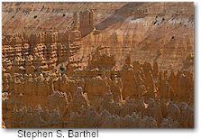 Description At Bryce Canyon National Park, erosion has shaped colorful Claron limestones, sandstones, and mudstones into thousands of spires, fines, pinnacles, and mazes. Collectively called "hoodoos," these colorful and whimsical formations stand in horseshoe-shaped amphitheaters along the eastern edge of the Paunsaugunt Plateau in Southern Utah.