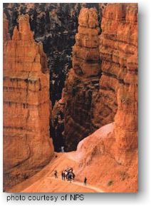the rim through the rock formations include: The Peekaboo Loop Trail also serves as a horse trail. Keep in mind that all trails below the rim involve steep climbs out of the canyon. Wear hiking boots with good traction and ankle support. Drink plenty of water. Know and respect your own physical limitations. Backcountry Hikes: The Under-the-Rim Trail extends 23 miles from Bryce Point to Rainbow Point and has eight backcountry campsites. The Riggs Spring Loop Trail (8.8 miles round trip) from Yovimpa Point has four backcountry sites. Both trails drop below the rim of the plateau and lead through forested areas. A backcountry permit is required for all overnight hiking. Permits are available at the Visitor Center for $5. Click here for more information about backcountry camping. |