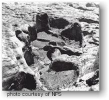 The Beginning The rock formations which comprise Rainbow Bridge are hundreds of millions of years old, deposited in a time when the climate and terrain were very different from what they are today. The base of Rainbow Bridge is composed of Kayenta Sandstone, reddish-brown sands and muds laid down by inland seas and shifting winds over 200 million years ago. The bridge itself is composed of Navajo Sandstone. This slightly younger formation (about 200 million years old) was created as wave after wave of sand dunes were deposited over an extremely dry period which lasted millions of years. These dunes were deposited to depths of up to 1000 feet (305 meters). Over the next 100 million years, both of these formations were buried by an additional 5000 feet (1,524 meters) of other strata. The pressures exerted by the weight of all these materials consolidated and hardened the rock of these and other formations. The Colorado Plateau The landscape that we know as the Colorado Plateau is, geologically speaking, a relative newcomer to the Southwest. The Colorado Plateau is an area of uplifted land, located generally around the Four Corners (the intersection of Colorado, Utah, Arizona, and New Mexico), with the largest sections of the plateau being found in Utah and Arizona. 60-80 million years ago, this area looked very different. It was a relatively stable, flat area. Then, geologic forces began to push the land upward. The greatest and most rapid uplift, however, did not take place until about 5.5 million years ago--a mere breath in geologic time. During this last uplift, the plateau rose some 3000 feet (915 meters) above the surrounding landscape. The uplift buckled the surface of the land. Mountains began pushing up and the earth warped and undulated like an ocean of rock. It began to resemble the fascinating assemblage that is so familiar to us today. But one key ingredient was still to come into play. Water--the Absent Artist When we look at Rainbow Bridge and other spectacular landforms on the Colorado Plateau, we are witnessing a landscape whose principle sculptor was water. Water was not always the infrequent visitor it is today.When the Colorado Plateau uplifted a few million years ago, river gradients were dramatically steepened, especially the Colorado's. These rivers combined their forces with that of the uplift to quickly cut many deep canyons into the plateau. During this time, periods of heavy rains, called pluvials, dramatically increased the amount of water flowing across the plateau. In addition to canyon cutting, water also played a role in other ways, including the formation of Rainbow Bridge. Much of the exposed rock on the plateau, including Rainbow Bridge, is sandstone. Sandstone is really nothing more than grains of sand, some fine, some coarse, bound together by water soluble materials, like calcium carbonate. Whether it's a raindrop or a river, water dissolves this bond and washes away the grains of sand, creating a myriad of fascinating shapes and forms. A Rainbow Made of Stone Initially, water flowing off nearby Navajo Mountain meandered across the sandstone, following a path of least resistance. A drainage known today as Bridge Canyon was carved deep into the rock. At the site of Rainbow Bridge, the Bridge Canyon stream flowed in a tight curve around a thin fin of soft sandstone that jutted into the canyon.